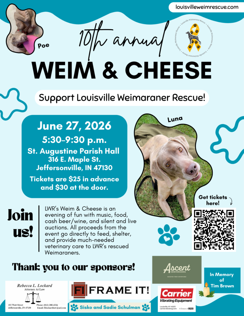 More information to come in the next few months. In the meantime, if you would like to send a donation (merchandise, jewelry, gift baskets, services, gift cards, vacation rental, etc.) for our live and/or silent auction, please contact Raina at raina@louisvilleweimrescue.com.